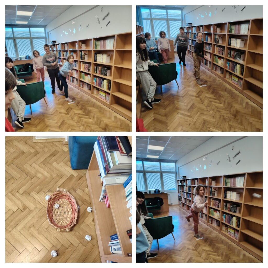 Na kraju radionice četvrtaši su se natjecali u bacanju “gruda” u košaru. Budući da u knjižnici nemamo snijeg (a vani se otopio), u košaru su bacali lopte od starog papira. Damir je jedini uspješno pogodio košaru i osvojio malenu nagradu.