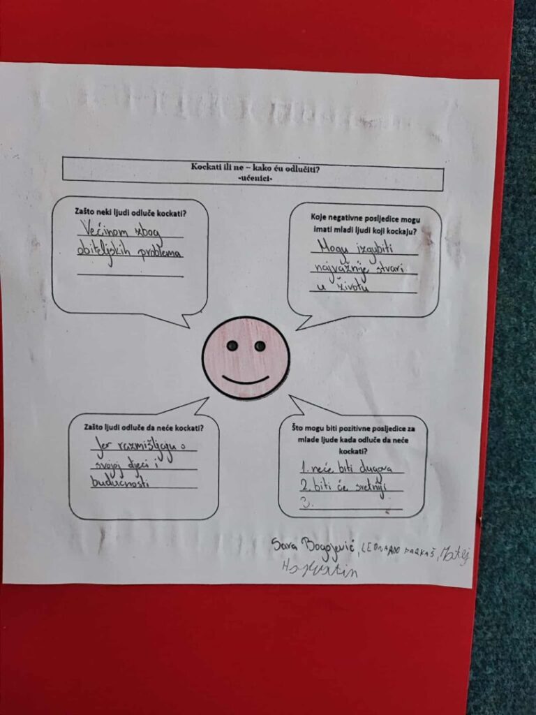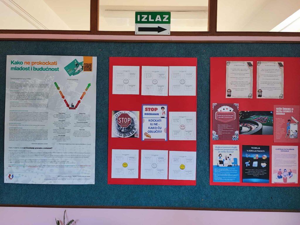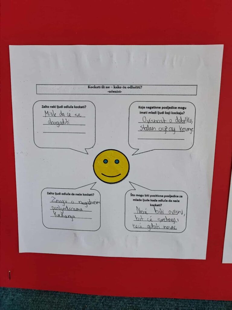 Svi učenici dobili su preventivno-edukativnu brošuru “Igre na sreću, kocka, ovisnost i mladi”. Zadatak učenika bio je i u skupinama raspraviti i zapisati najvažnije odgovore na pitanja zašto neki ljudi odluče da (ne)će kockati, koje negativne posljedice mogu imati mladi ljudi koji kockaju i koje pozitivne posljedice imaju mladi ljudi kada odluče da neće kockati. Svoje radove zalijepili su na plakate koji su postavljeni na panou.
