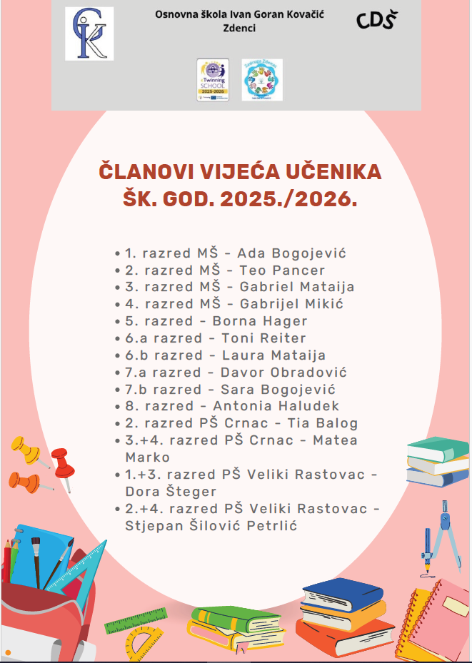 Vijeće učenika čine predstavnici učenika svakog razrednog odjela i bira se na početku školske godine, a uloga mu je promicanje interesa svih učenika škole te predlaganje mjera za poboljšanje njihovih prava i interesa kako bi se učili demokraciji i ravnopravnosti. Osim toga, vijeće učenika djeluje na humanitarnom, obrazovnom, zabavnom i informativnom području naše škole.